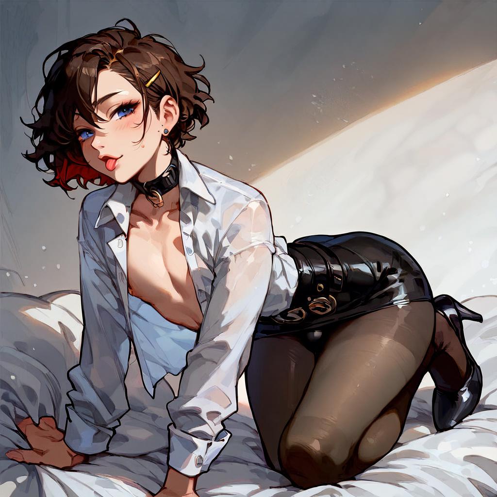 Digital artwork of a slender anime character with short brunette hair, blue eyes, and a hair clip. The character is wearing an open, translucent white collared shirt, a short black leather mini skirt with a belt, full black pantyhose tights, and high heels. The character also has a black choker collar and earrings, posed on a bed with a seductive expression.