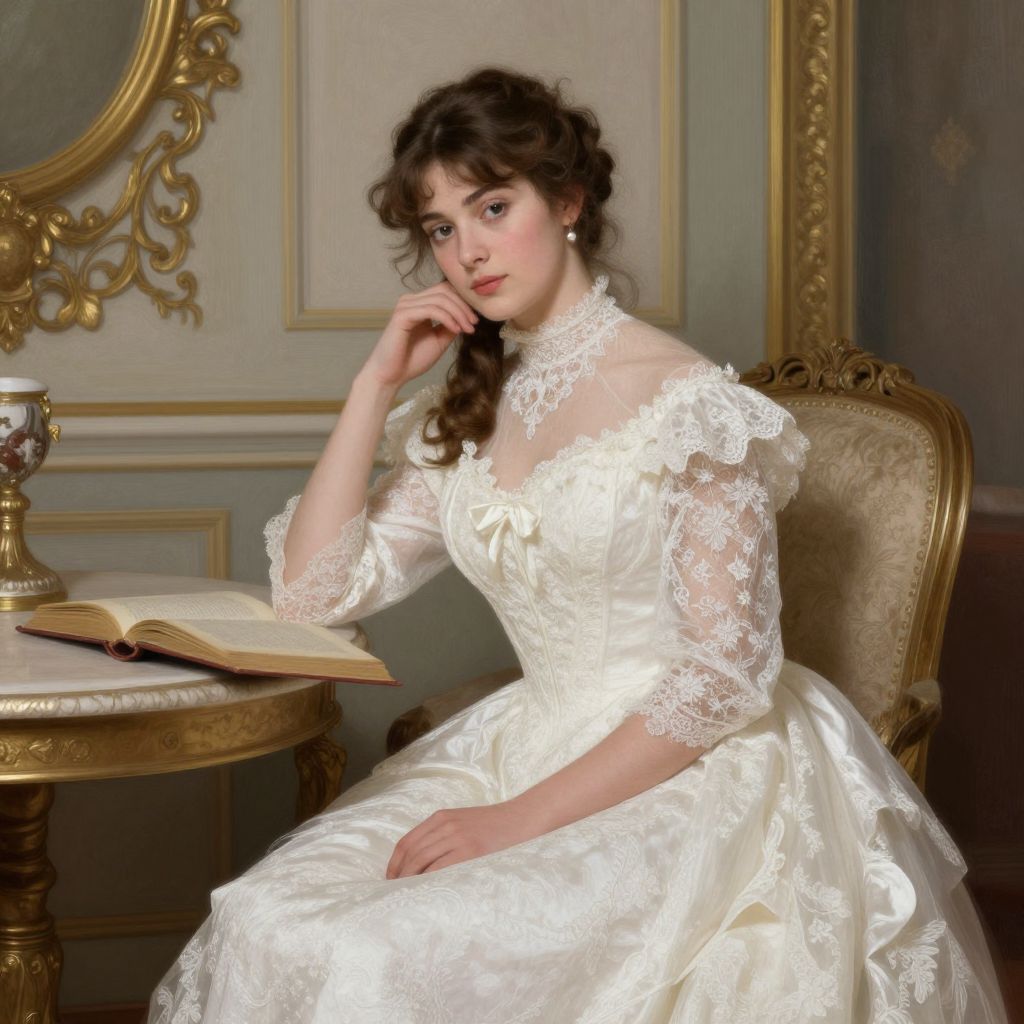 A finely detailed digital artwork reminiscent of Francis Coates Jones' style, depicting a woman in an elegant white gown adorned with intricate lace, seated gracefully by a table with an open book, set against a backdrop of ornate decor and soft, natural lighting.