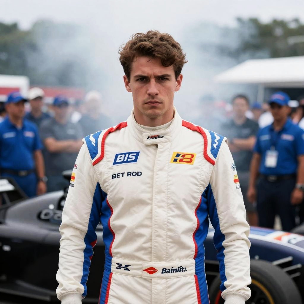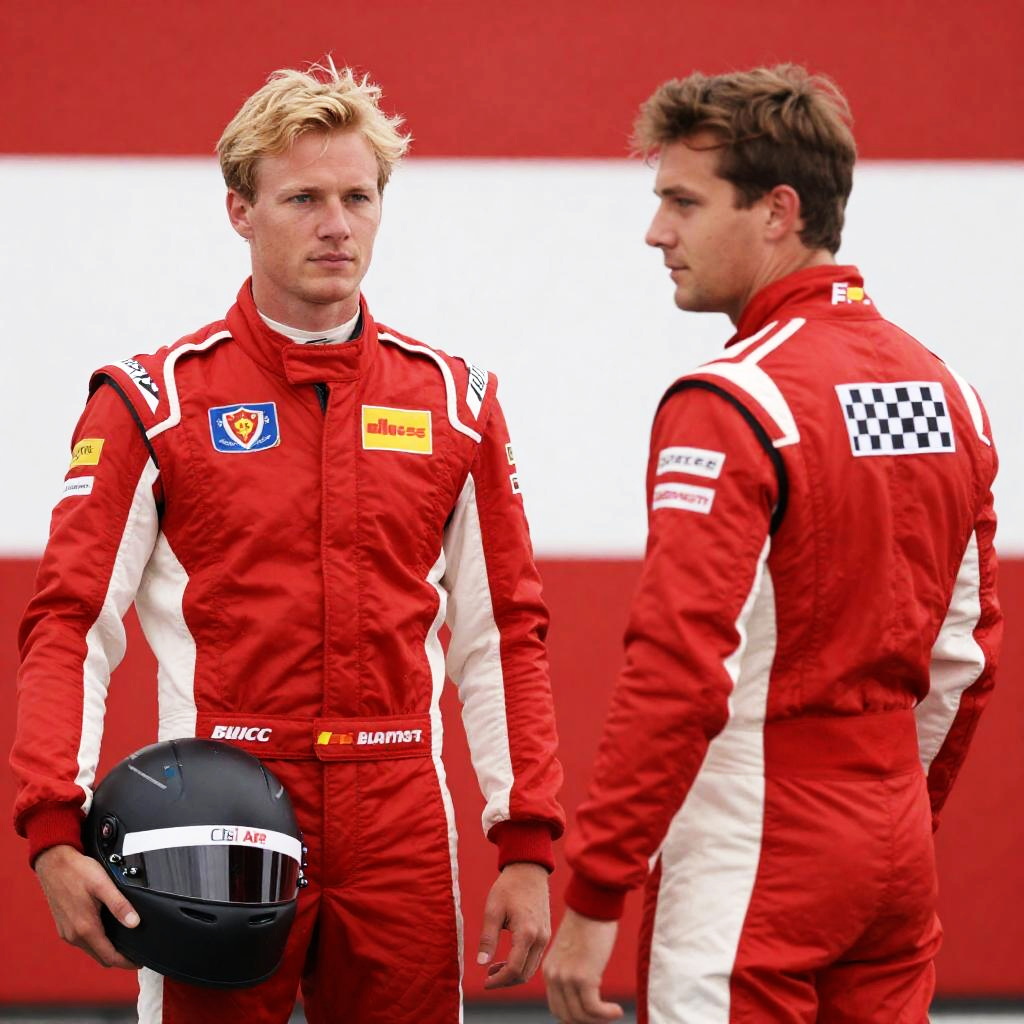 Photograph of two teenage boys in red racing suits standing near a race car. One boy with blonde hair sits with arms crossed, looking serious. The other boy with brown hair holds a helmet, standing. Background includes a red truck and garage. White and red race car in the foreground. Overcast sky.