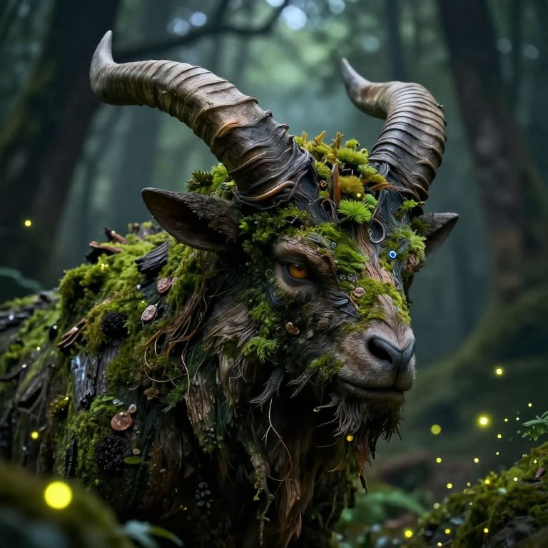 Digital artwork of a mystical, horned goat adorned with moss, fungi, and glowing fireflies in a dark, enchanted forest.