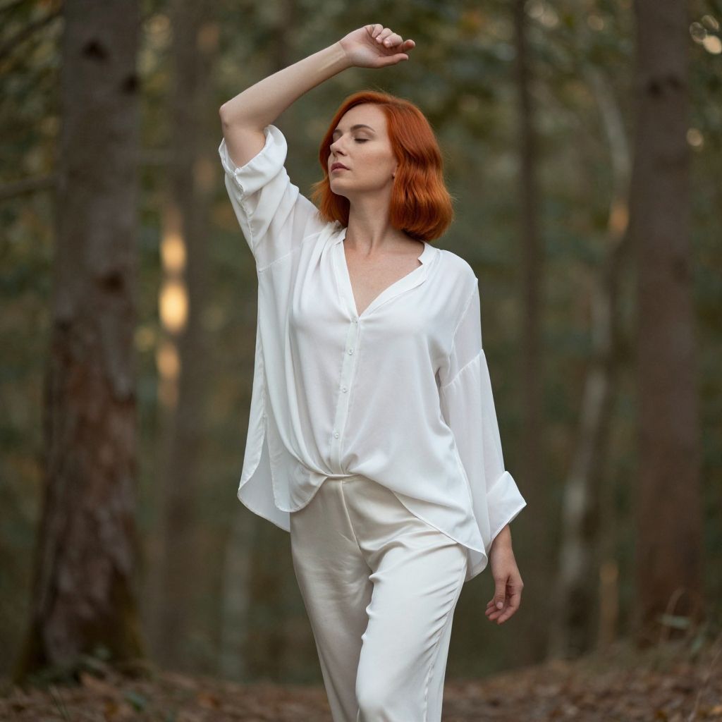 Photograph of a fair-skinned, red-haired woman with shoulder-length hair, wearing a loose, white, V-neck blouse and white pants. She stands in a forest with tall, blurred trees in the background. Her right arm is raised gracefully above her head, and her eyes are closed, giving a serene, contemplative expression. The natural light filters softly through the trees, highlighting her white attire and creating a gentle contrast with the forest's dark, earthy tones.