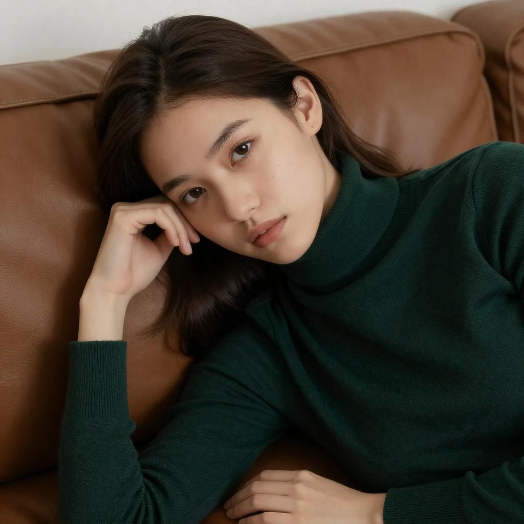 Photograph of a young woman with fair skin and dark brown hair lying on a brown leather couch. She wears a dark green turtleneck sweater and gazes thoughtfully at the camera with her right hand resting near her face. The lighting is soft, highlighting her calm expression.