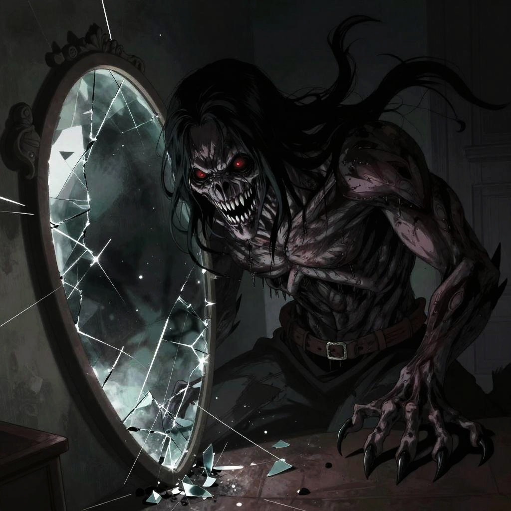 Scary wallpaper anime concept depicting a monstrous creature emerging from a cracked mirror in a dim room, broken glass shards reflecting eerie light, detailed textures, sharp contrast shadows, unsettling vibe, supernatural horror elements, graphic style.