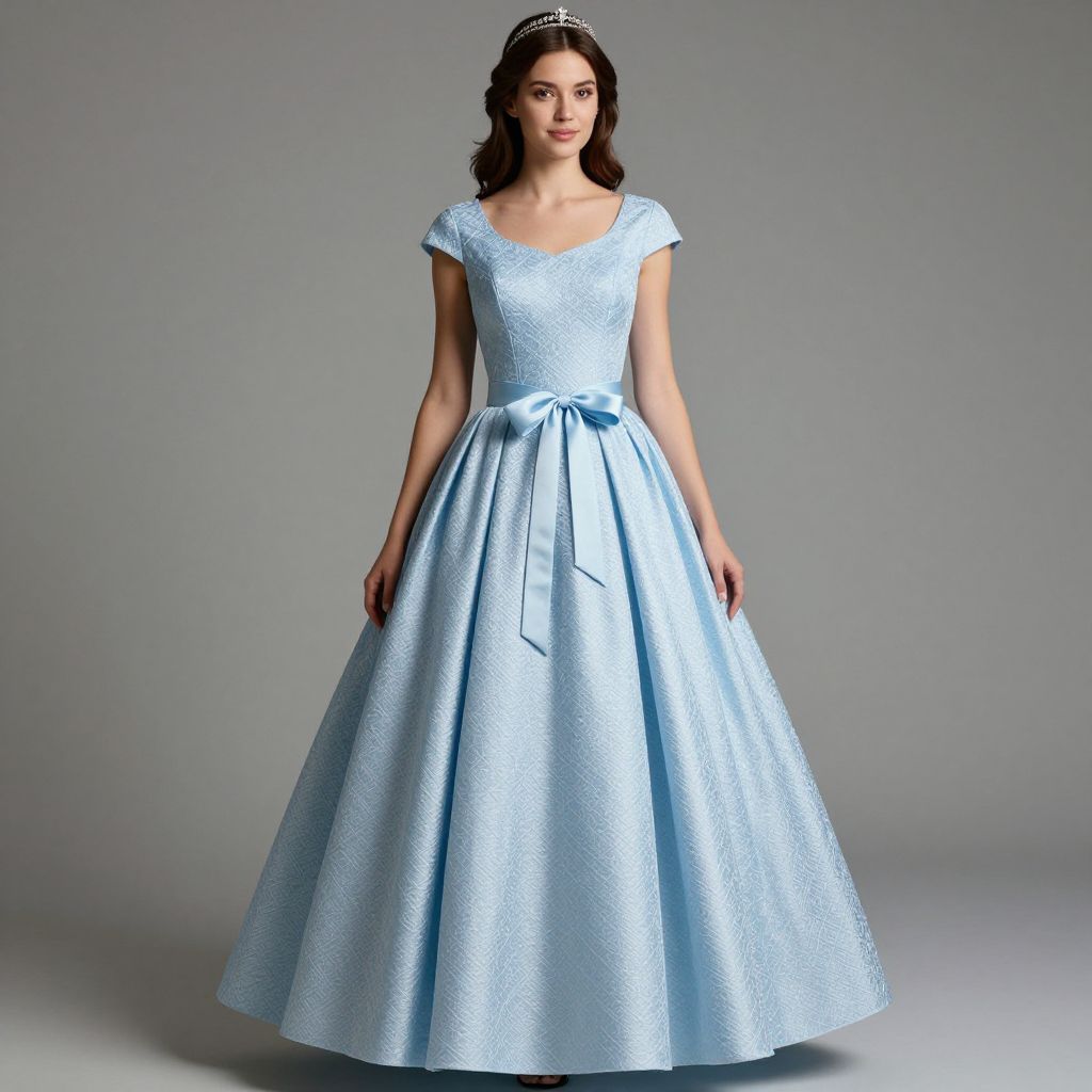 Photograph of a young woman in a light blue, textured ball gown with a V-neck, short sleeves, and a bow at the waist, wearing