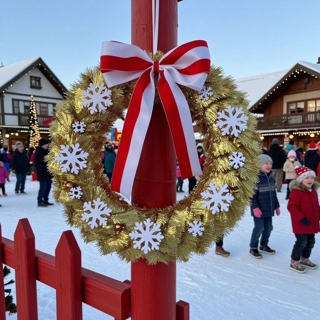 A festive wreath with gold foil edges, red and white ribbons, and small paper snowflakes, tied to a red wooden fence post in a festive village square during a holiday parade, with colorful decorations and children laughing in the background under a clear winter sky.