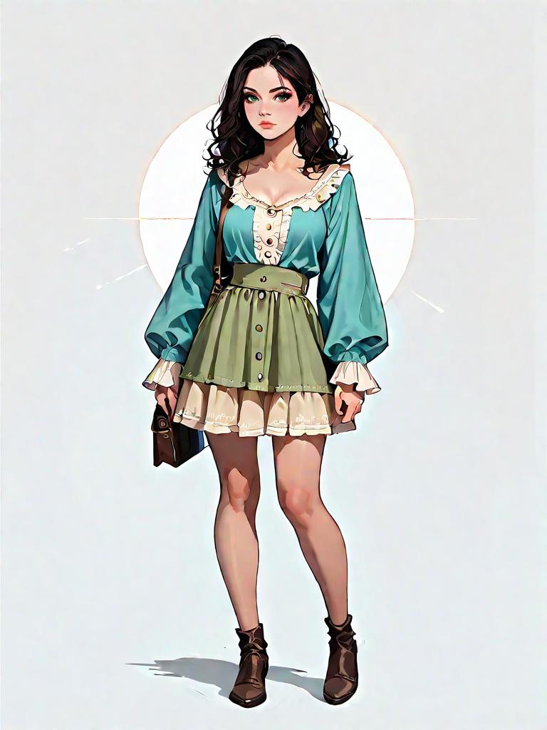 1girl, source_comics, realistic face, full body shot, Woman, casual chic, sleeveless mock turtleneck crop top in a multicolored chevron knit pattern, A-line olive green button-up corduroy skirt, mid-thigh length, wide gold cuff bracelet.
