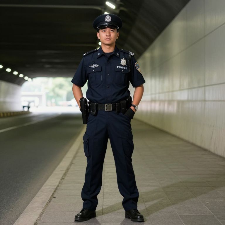 "Underpass Official Clothing, police officer standing in a tunnel with his hands in his pockets"