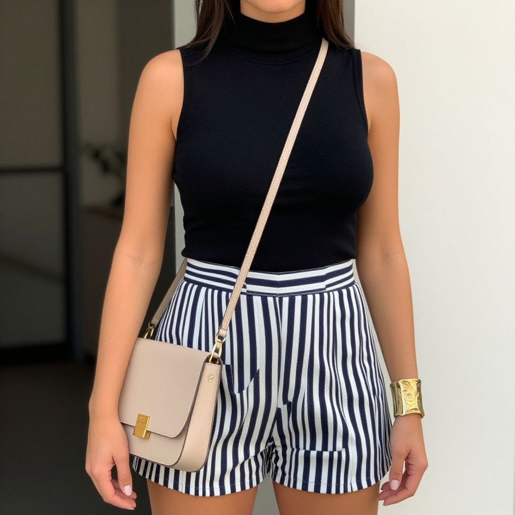 "Woman, casual chic, sleeveless black high-neck top, navy and white striped shorts with a tailored fit, beige crossbody bag with a flapped closure, gold cuff bracelet on one wrist.. Sexy. Pretty face and beаutiful eyes. Big breasts."