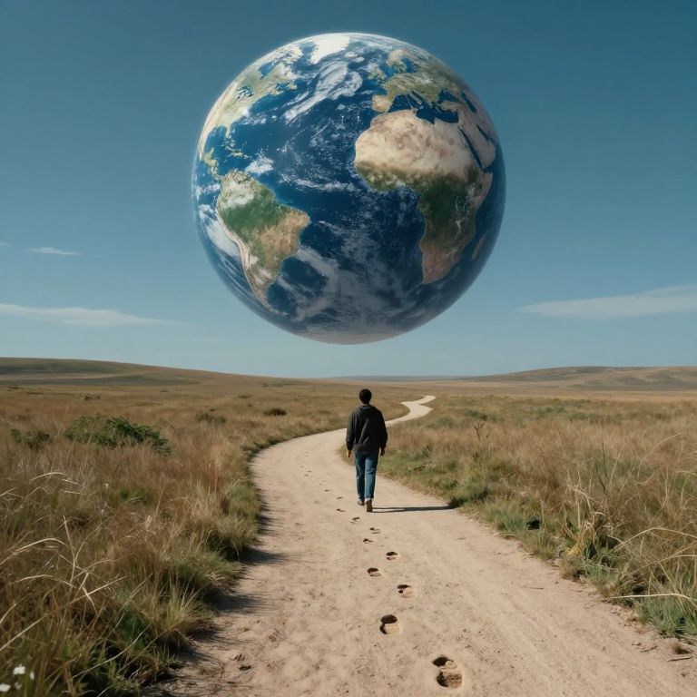 In a serene expanse where the Earth hangs above like a cosmic beacon, a solitary figure traverses a winding path, their reversed footprints weaving a tale of introspection and return, evoking a profound sense of cyclical journey and existential reflection.