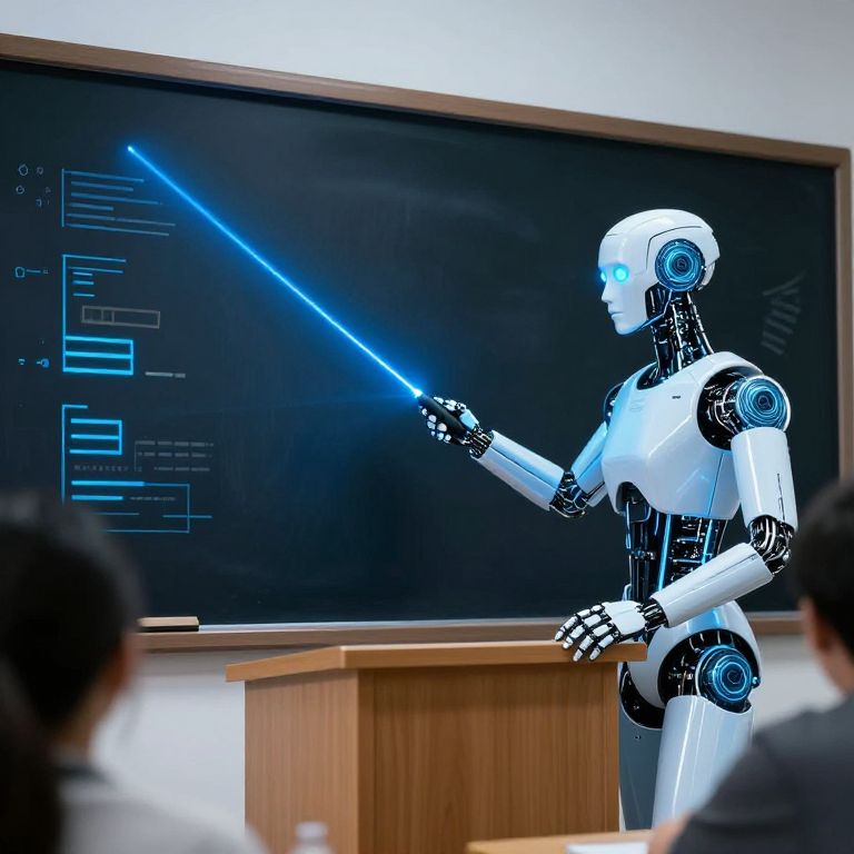 Virtual Reality fine grain texture - 16x9 ar, 16mm focal length f/4 retrofuturism style, a giant metallic robot executive leads a presentation, 3 diverse and engaged humans watch intently.,