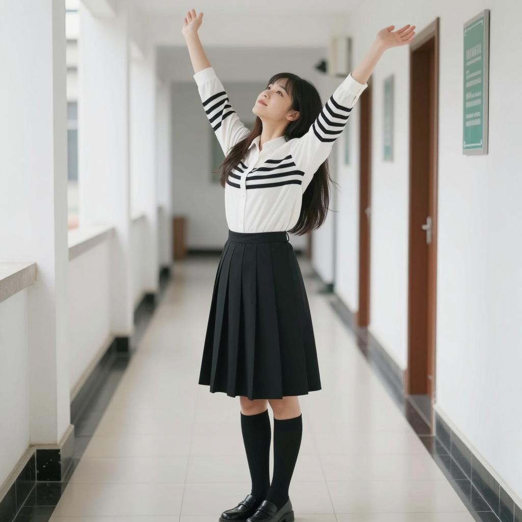 Asian woman with long black hair, white blouse, plaid skirt, and maroon shoes, sitting on windowsill, arms raised, legs crossed. Green leafy background, sunlight filtering through window. White wall below windowsill. Bright, natural light.
