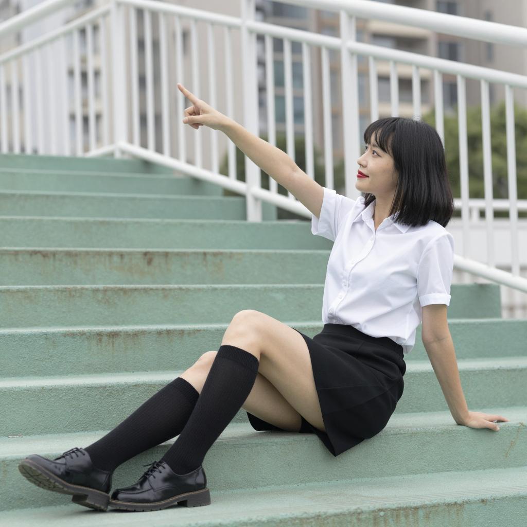 Young Asian woman with long black hair wearing a white blouse, plaid skirt, and maroon shoes sitting on a white windowsill with her legs crossed and arms raised. The background features green leafy trees with sunlight filtering through the window, creating a bright and natural atmosphere.