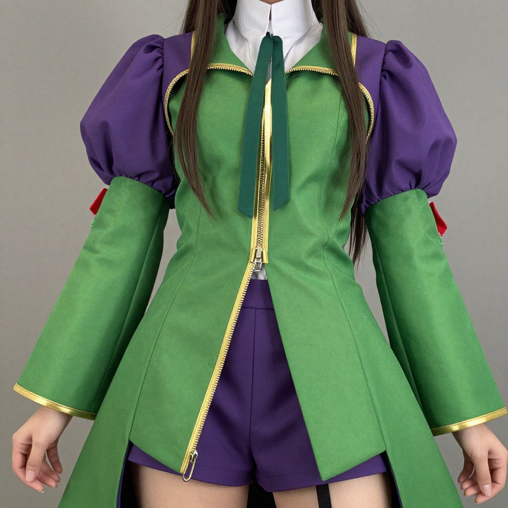 A close-up view of a woman wearing a cosplay outfit inspired by the anime Code Geass. The outfit features a green jacket with gold trim and zipper details, purple puffy sleeves, and matching purple shorts. The costume includes a white collar and dark green tie, capturing the stylized look of the character's attire.