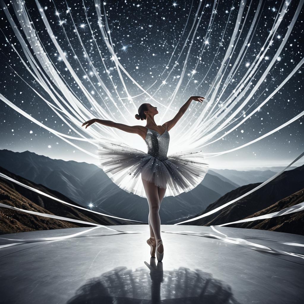 A surreal fashion scene of a ballet dancer in a luminous silver tutu, set against an epic landscape with twinkling star clusters and flowing ribbons of light, dynamic low-angle composition, bold curving lines, sophisticated and clean