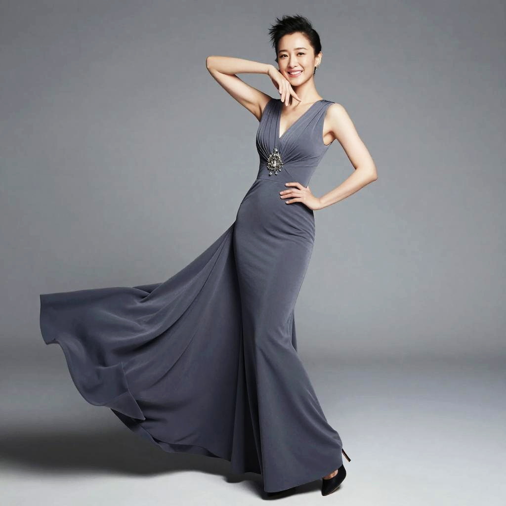 Photograph of an Asian woman with short, spiky black hair, wearing a floor-length, deep blue, sleeveless gown with a plunging V-neckline and a silver beaded embellishment at the waist. She poses with one hand on her hip and the other touching her chin, smiling. The gown flows gracefully with her movement, and she wears black high heels. The background is a simple gray gradient, highlighting her elegant and confident stance. The lighting is soft, emphasizing the smooth texture of the fabric and her smooth, fair skin.