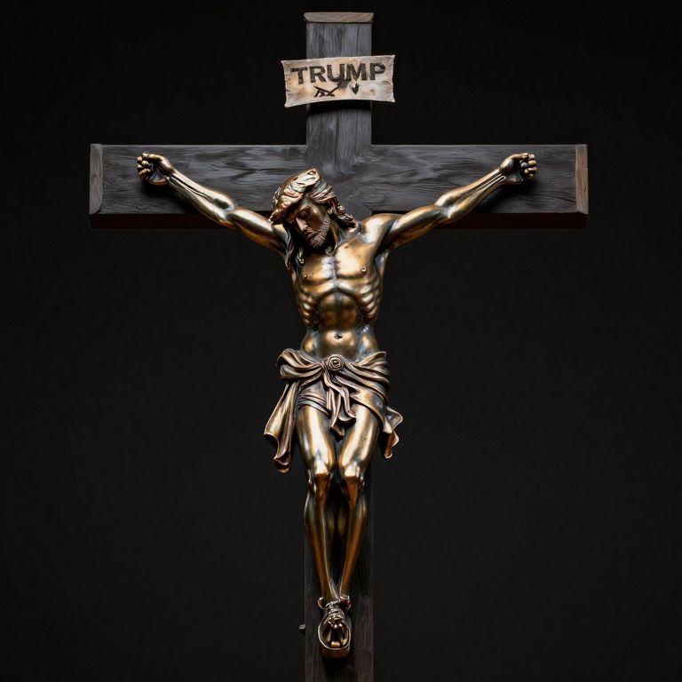 Trump crucifix, hyperrealistic sculpture of former president on a crucifix, metallic textures, dark background, strong chiaroscuro, symbolizing sacrifice and controversy