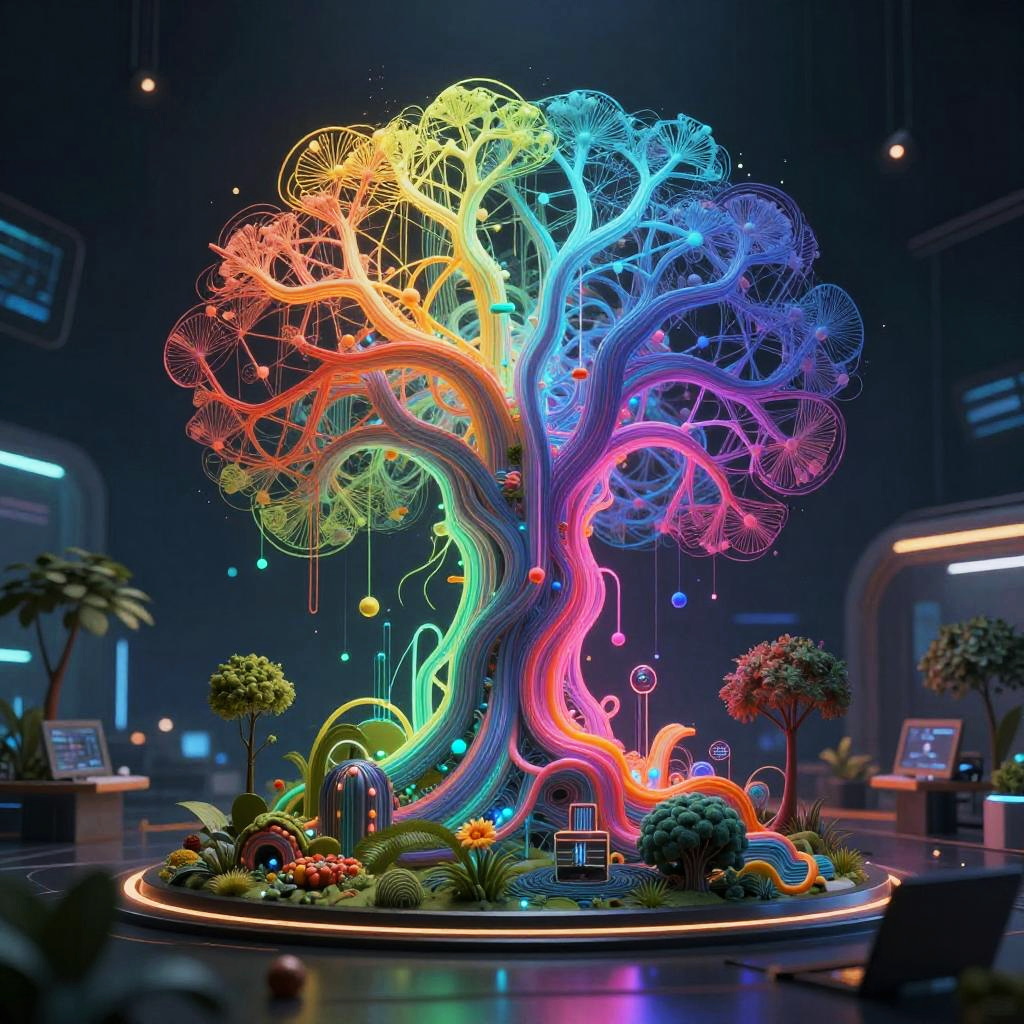 Open source AI art vibrant digital landscape, intricate neural network patterns, colorful algorithmic brush strokes merging nature and technology, futuristic art studio environment, high detail, dynamic light reflections, cyberpunk style