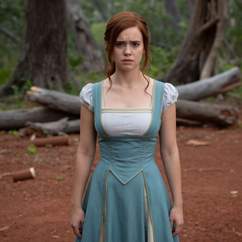 Photograph of a young woman with fair skin and red, slightly messy hair standing in a forest. She wears a blue, medieval-style dress with a white, puffed-sleeve blouse underneath and gold trim. Her expression is serious and slightly concerned. The background features large, dark tree trunks and fallen logs on a red, earthy forest floor. The lighting is natural, highlighting her dress's texture and the forest's earthy tones. The image has a realistic, cinematic quality.