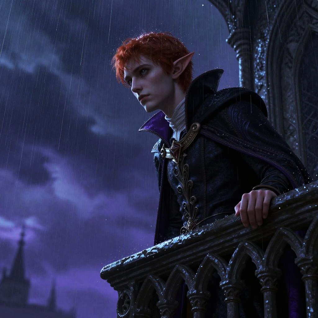 (complex illustration, close-up from below:1.3) heavy rain, portrait young male elf boy vampire mage looking from balcony, gothic, short red hair, medieval, dark fantasy themes, (purple, blue:1.2), rain, (atmosphere), sky with dark clouds, hyperrealistic textures