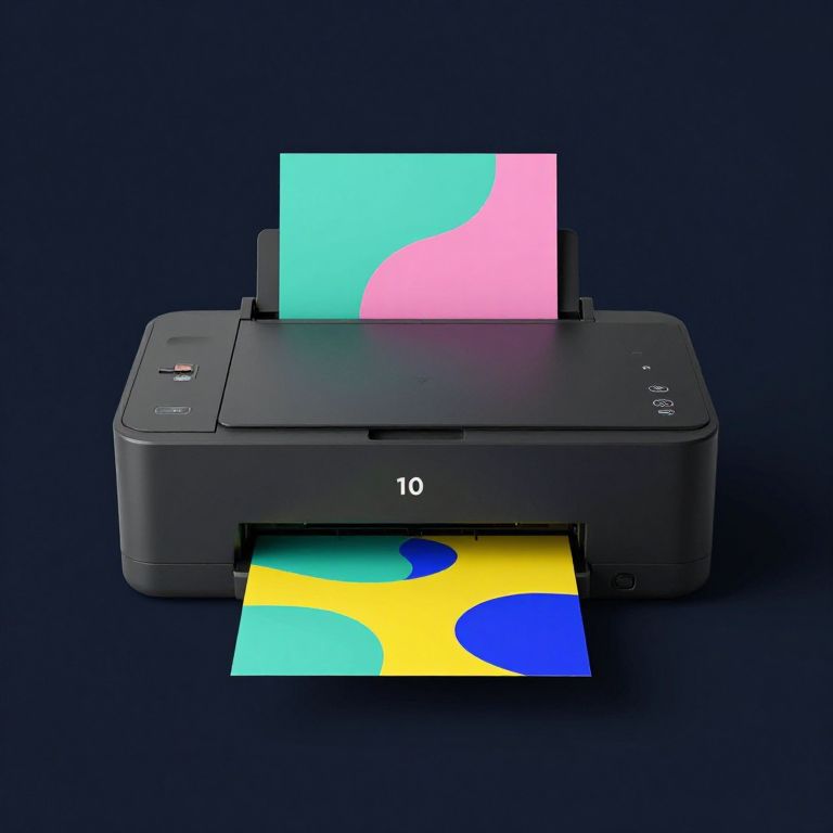 Photograph of a black inkjet printer against a dark blue background. The printer is in the center, with a colorful, abstract print emerging from the bottom and a matching print partially ejected from the top. The prints feature vibrant swirls of pink, blue, green, and yellow. The printer has a smooth, matte texture and displays a small power button and other controls on the left side. The number "10" is prominently displayed on the front. The overall style is modern and minimalistic, focusing on the printer and the vivid, contrasting colors of the prints.