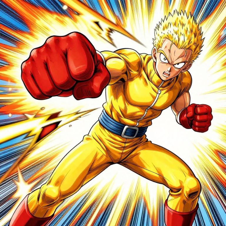 Saitama in action pose delivering a powerful punch, motion blur emphasizing speed and impact, wearing iconic yellow suit and red gloves, explosion effects around, high-energy manga style with sharp lines and bright colors