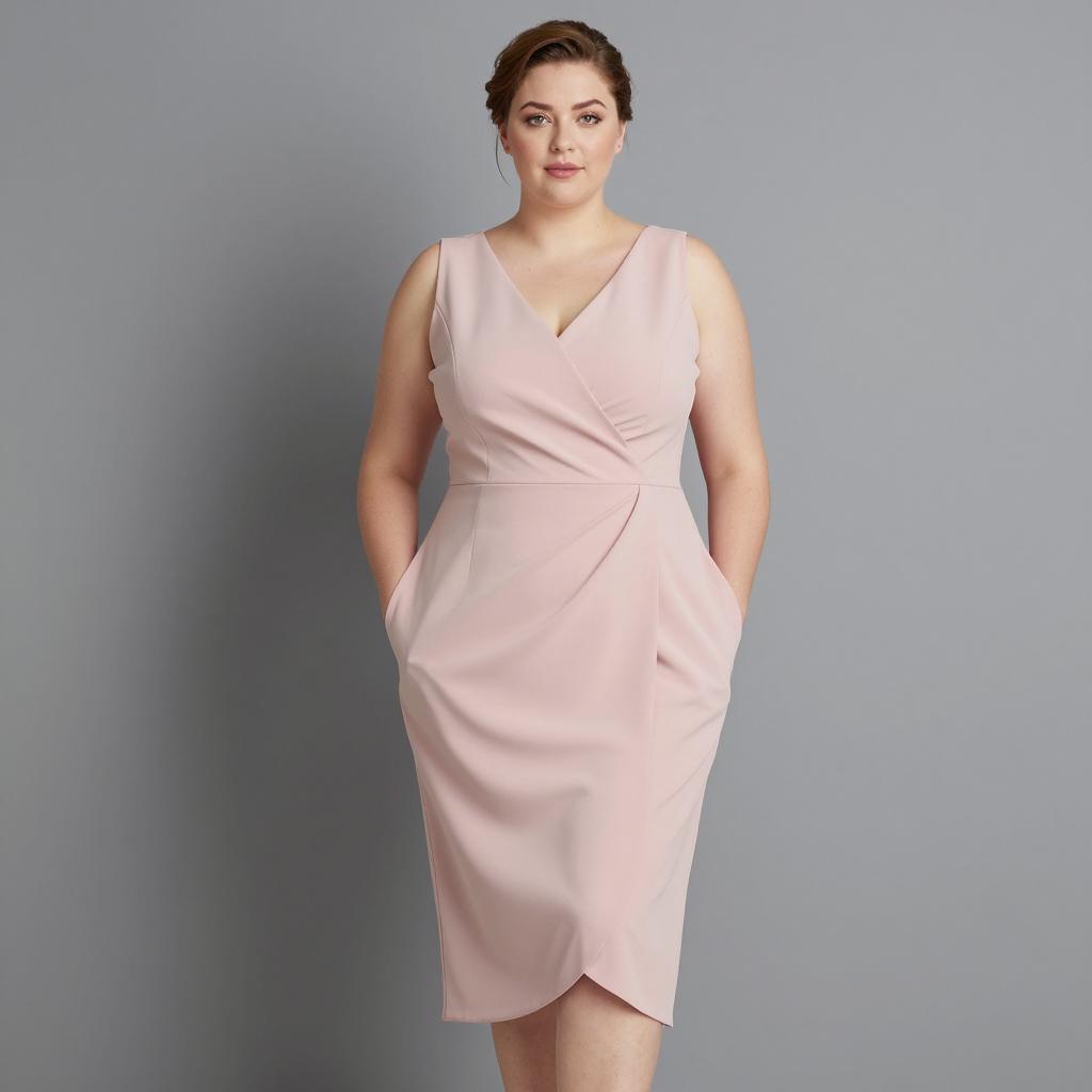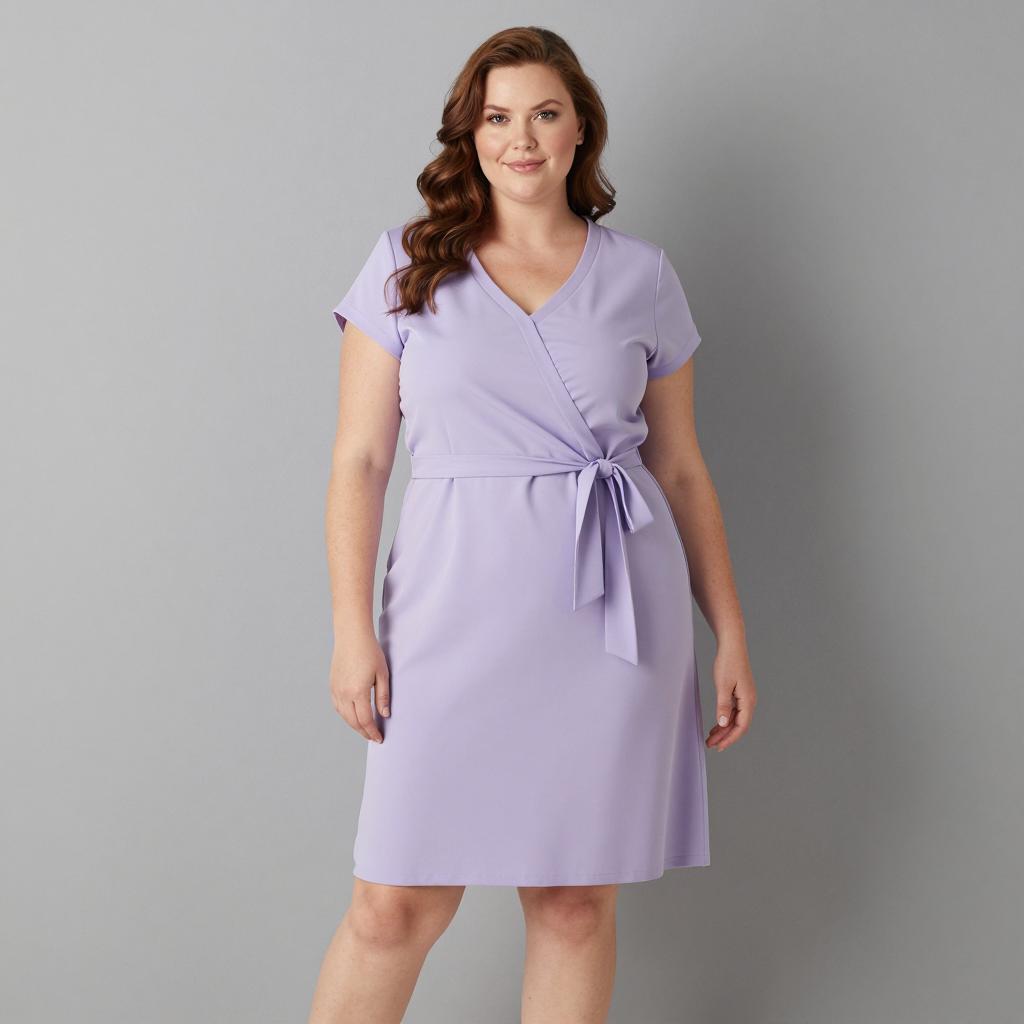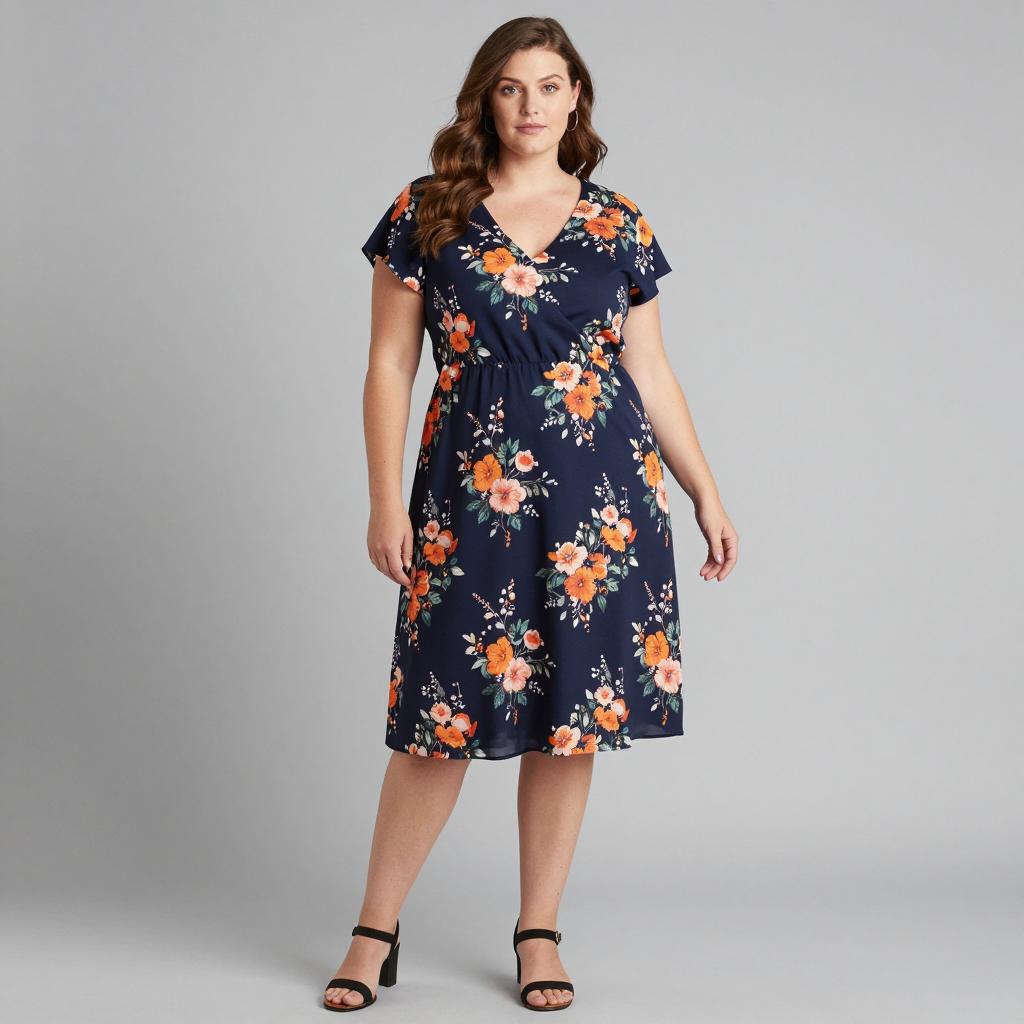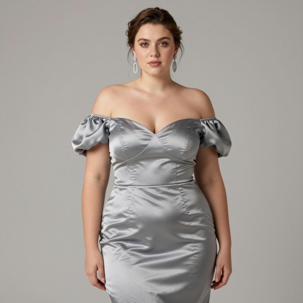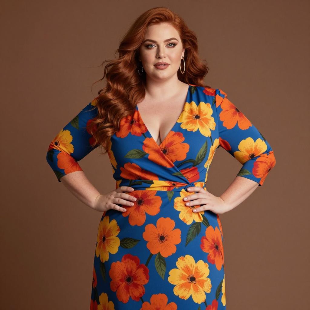 Poodle skirt dress costume, photograph of a plus-size woman, brown hair, bangs, pink flower hair accessory, wearing a blue polka dot dress with ruffled sleeves, waistband, standing, neutral gray background, looking at camera, casual, studio lighting, realistic, full body shot, relaxed pose
