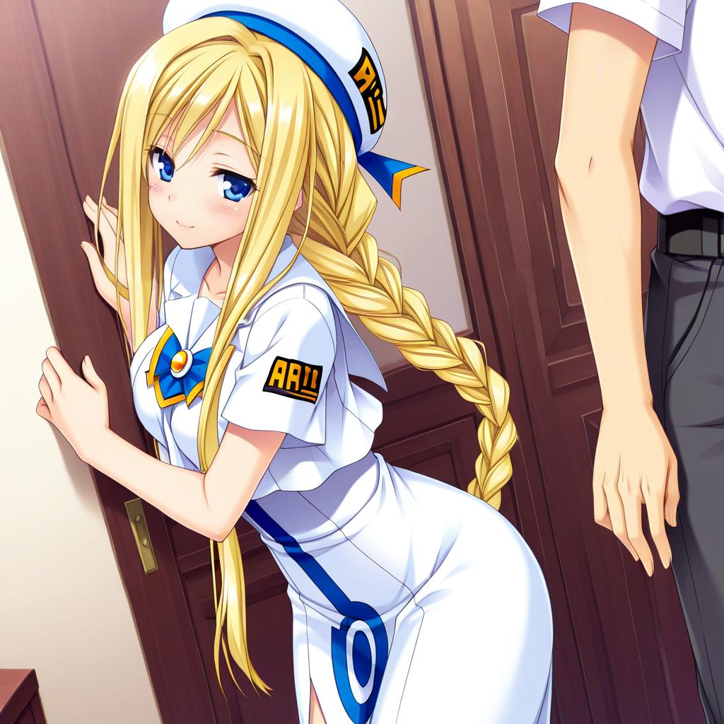 Digital illustration of a young anime girl with long blonde hair styled in a braided ponytail, wearing a white Aria Company uniform with a sailor collar and short sleeves. She has blue eyes and a gentle expression, standing near a wooden door indoors, with part of another person visible in a white shirt and dark pants.