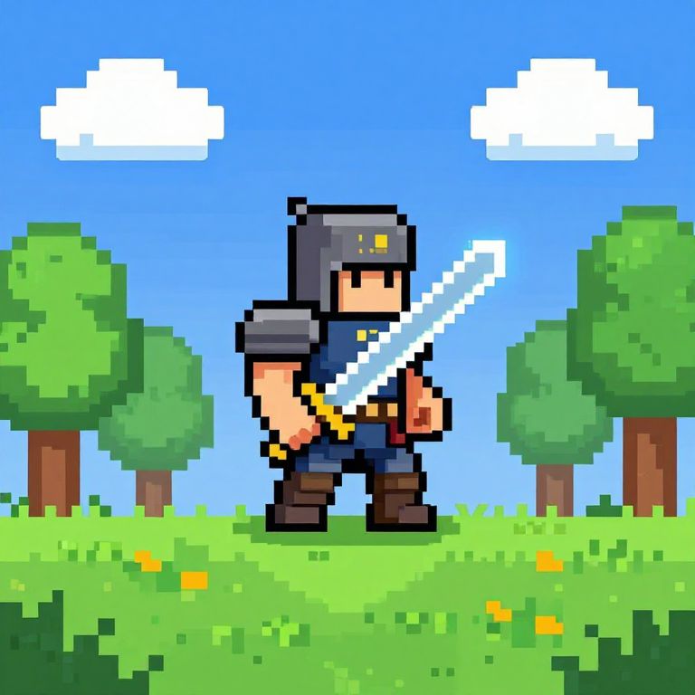 Pixel art pixcel character, a brave warrior with a glowing sword standing on a pixelated grassy hill, surrounded by pixel trees and a bright blue sky with fluffy pixel clouds, classic RPG game vibe, highly detailed pixel textures and shading