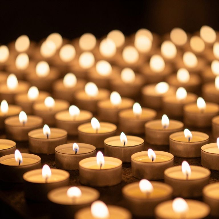 9-11 memorial candles flickering at night, hundreds of tiny flames glowing softly in the darkness, detailed close-up with gentle bokeh background, atmosphere of remembrance and hope, warm color tones with subtle shadows, intimate setting