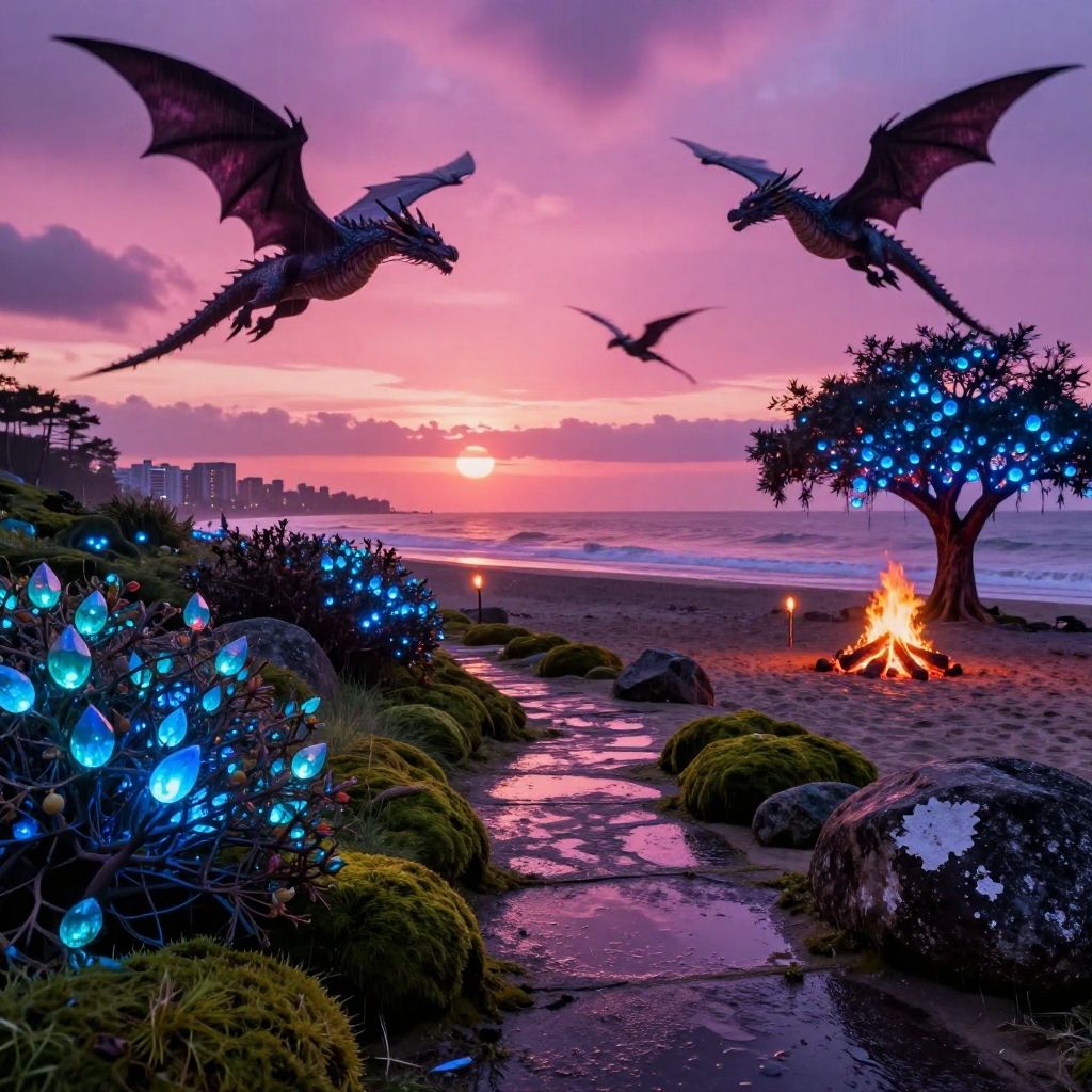 A mesmerizing sunset, beach, city, flying dragons, moss, electrified bushes, chipped boulder, footpath, rain, lit by bonfires, glowing magical emeralds, glowing fruit on magical trees, fluorescence, torches, sunlighteverything looks perfect, good vibes, positivity, most beautiful picture in the world, <8k, high detail, uhd, sharp focus, palette, photorealistic, absurdres, extreme detail, as much detail as possible, extremely high visibility>, dark pink, shiny violet, shiny blue, dark white