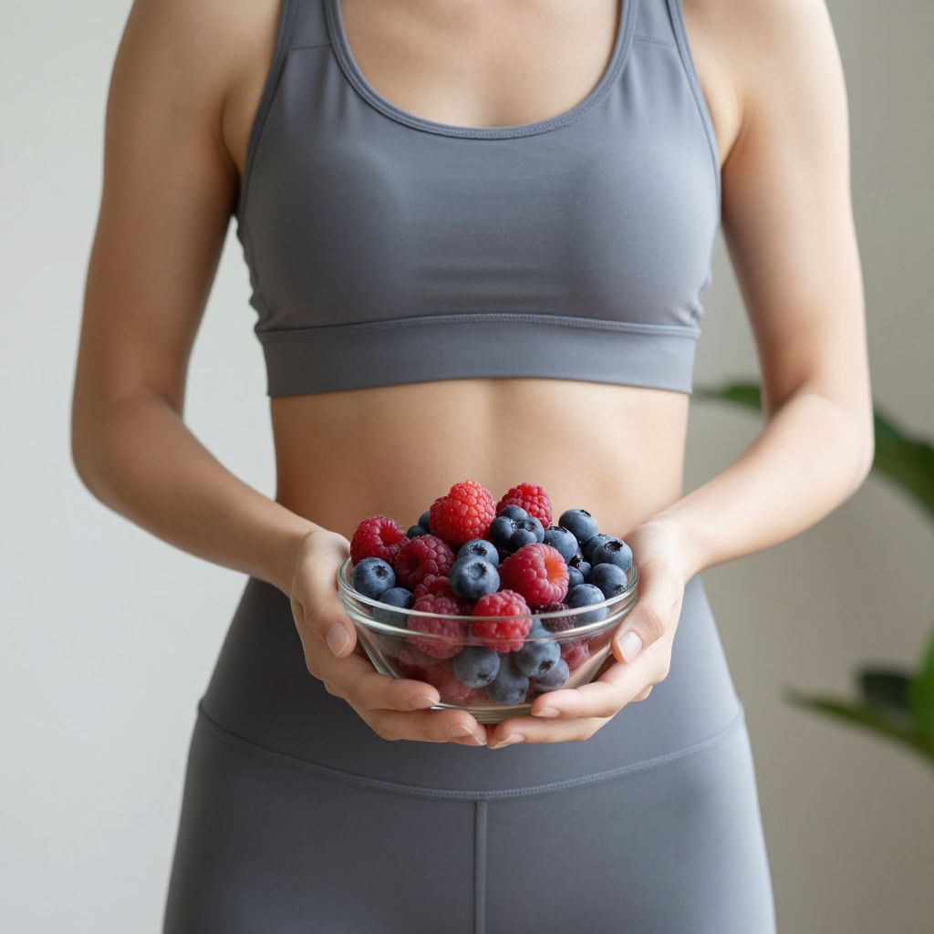 Photograph of a woman in a gray sports bra and matching leggings, holding a clear bowl of mixed berries (raspberries, blueberries) in