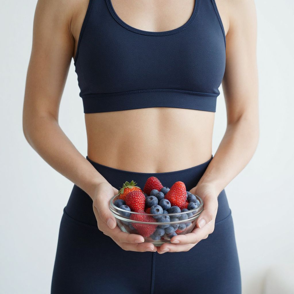 Photograph of a fit, light-skinned woman from the neck to mid-thigh, wearing a gray sports bra and matching high-waisted leggings. She holds a clear glass bowl filled with fresh blueberries, raspberries, and strawberries in both hands, positioned at her waist. The background is softly blurred, with a hint of green plant leaves on the right. The lighting is bright, highlighting her toned, flat stomach and the vibrant colors of the berries.