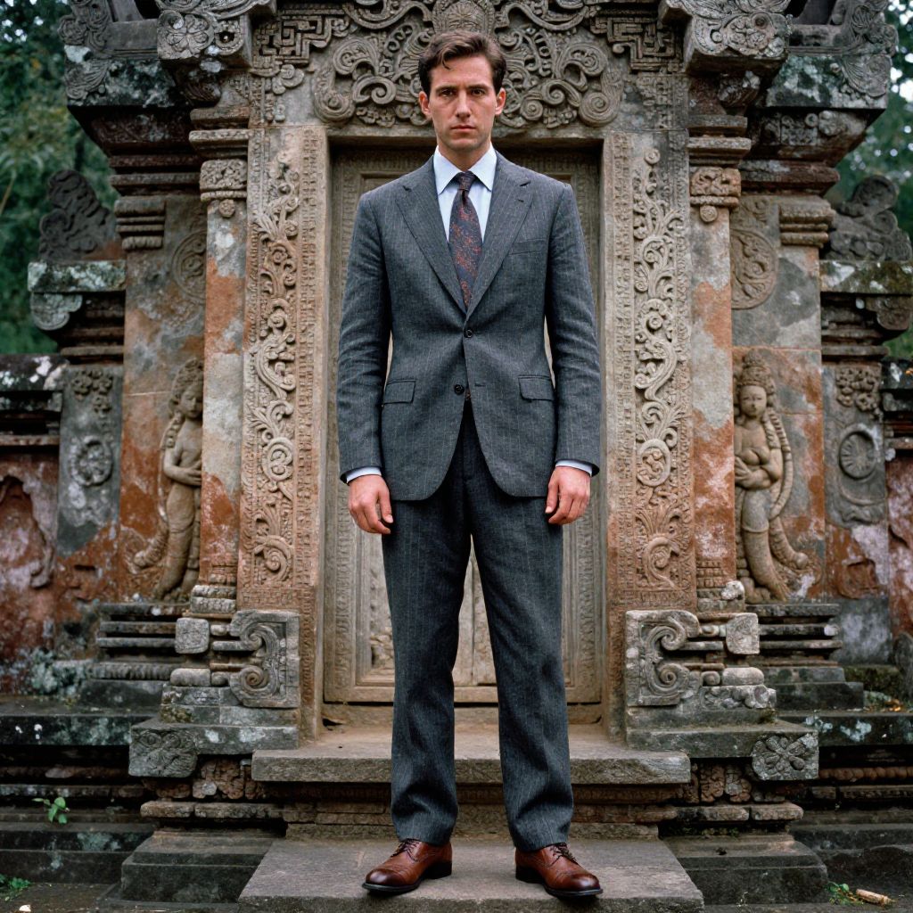 A man, charcoal gray pinstripe suit, slim cut, breathable linen blend, pale blue dress shirt, patterned silk tie, brown leather brogues, ancient stone temple, intricate carvings, surrounded by lush greenery, chromogenic film, confident expression. Man has masculine face and piercing eyes