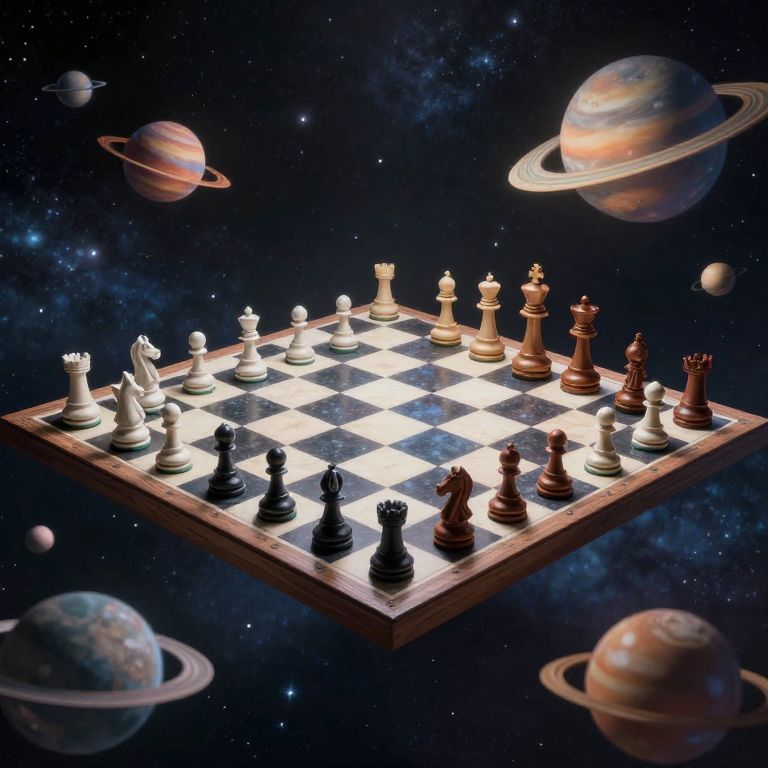 A colossal chessboard hovers serenely in the cosmos, its pieces crafted from celestial bodies, as planets drift lazily into place, weaving a cosmic game of strategy across the infinite expanse.