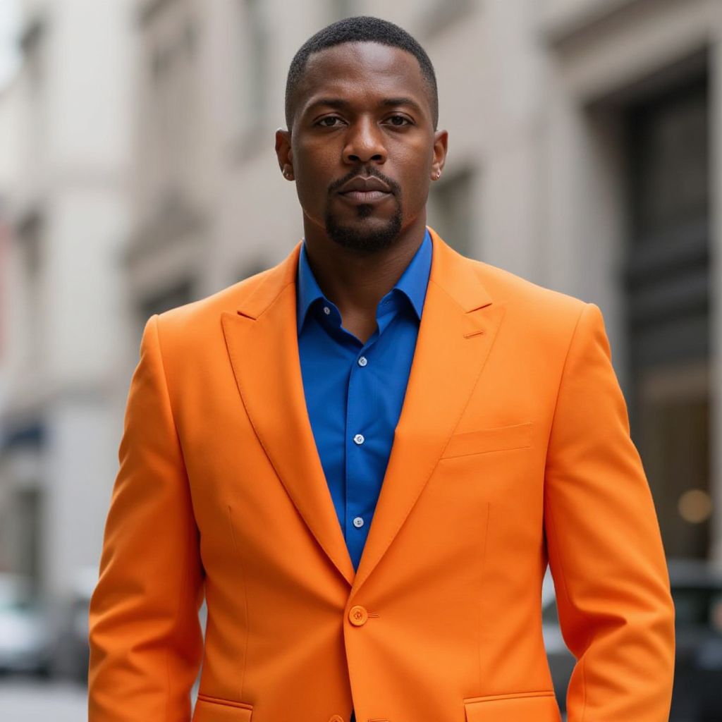 This striking image features a man in a vibrant orange suit, exuding confidence and style against a backdrop of urban architecture. The combination of the bold suit and the blue shirt creates a sophisticated yet eye-catching contrast, perfect for fashion-forward presentations.
