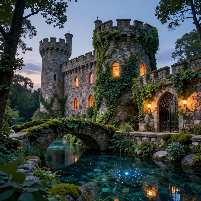 Photograph of a medieval-style stone castle at dusk, illuminated by warm yellow lights. The castle, adorned with lush green ivy, features two tall, cylindrical towers with crenellated tops. Arched windows with glowing orange light emit a cozy ambiance. A stone bridge with an archway crosses a clear, reflective pond, which contains small, sparkling lights. The background showcases a twilight sky with soft hues of blue and pink. Surrounding the castle and bridge are dense trees and greenery, adding a serene, fairy-tale-like atmosphere to the scene.