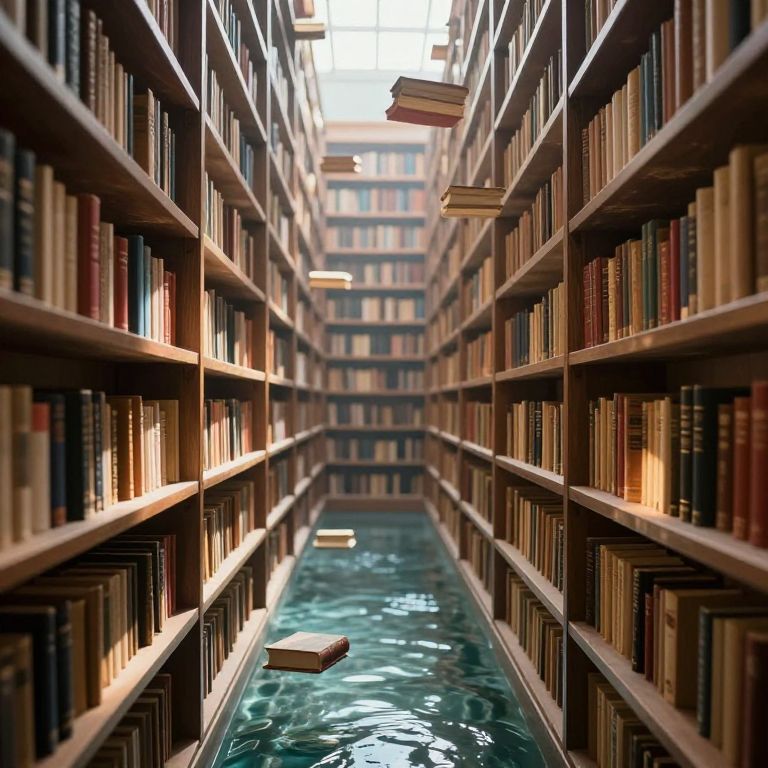 Photograph of a narrow, indoor library aisle filled with tall, wooden bookshelves on both sides, lined with books of various sizes and colors. A small, reflective turquoise canal runs down the center, with a few floating books. The shelves recede into the background, creating a vanishing point effect. Overhead, bright light filters through a skylight, casting soft shadows. The overall scene has a magical, slightly surreal atmosphere, combining traditional library elements with the unexpected presence of water and floating books.