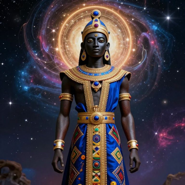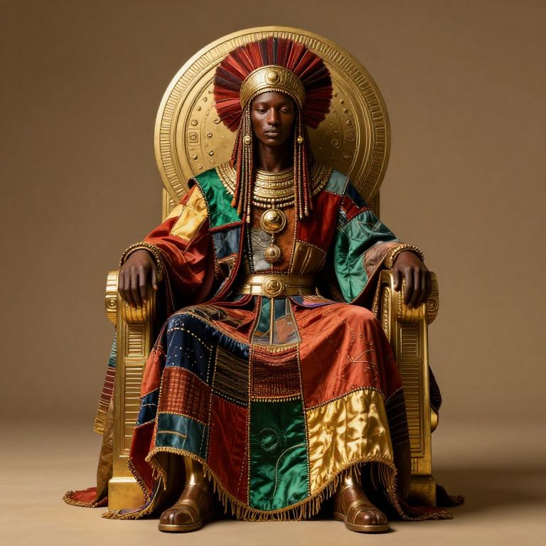 Patchwork FOCUS: the god king of saturn | SETTING: Sitting in his golden futuristic intergalactical throne | COLOUR: earthy mahogany, crimson, gold and emerald | STYLE: afrofuturism,
