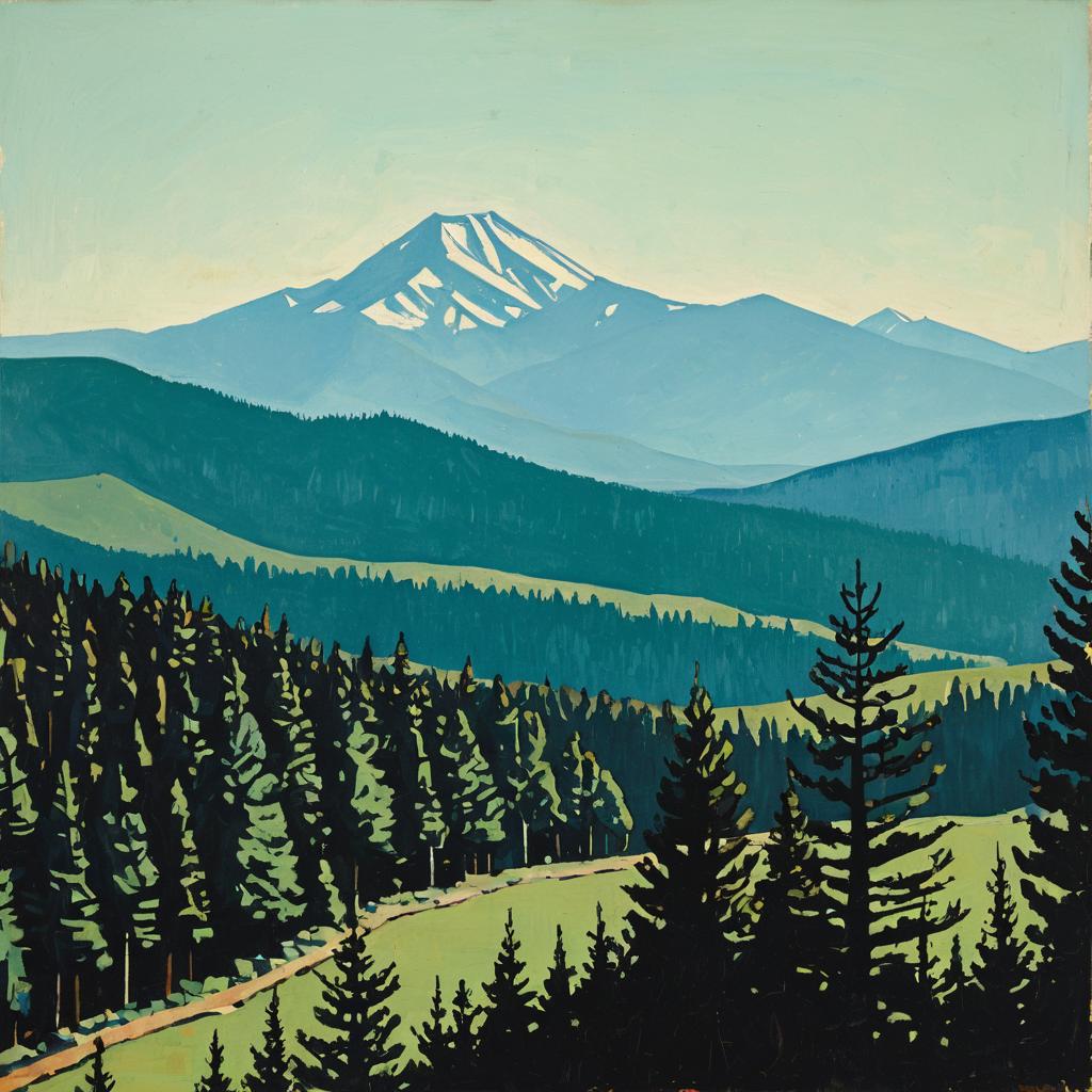Painting of a mountainous landscape featuring snow-capped peaks in the distance and a dense forest of tall pine trees in the foreground. The artwork uses geometric shapes and a limited palette of muted greens, blues, and browns, inspired by the style of Richard Diebenkorn.