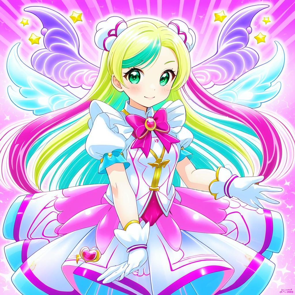 Anime-style digital artwork featuring a magical girl character with long, two-tone gradient hair in shades of blonde, pink, and turquoise. She has large green eyes and wears a detailed outfit with white gloves, a pink waist bow, and a pink and white dress with gold accents. The background is bright pink with shining stars and stylized glowing wings, emphasizing her magical theme.