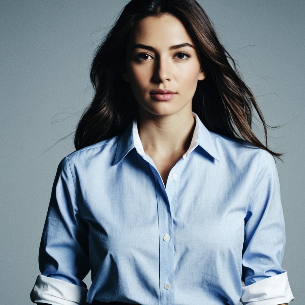 Photograph of a young woman with light olive skin and dark brown, wavy hair that falls past her shoulders. She has a neutral expression with slightly parted lips and dark, defined eyebrows. She is wearing a light blue, long-sleeved button-up shirt with the collar slightly open and the sleeves rolled to the elbows. The background is a plain, soft gray, highlighting her face and shirt. The lighting is even, with subtle shadows adding depth to her features. The image has a clean, modern, and professional style.