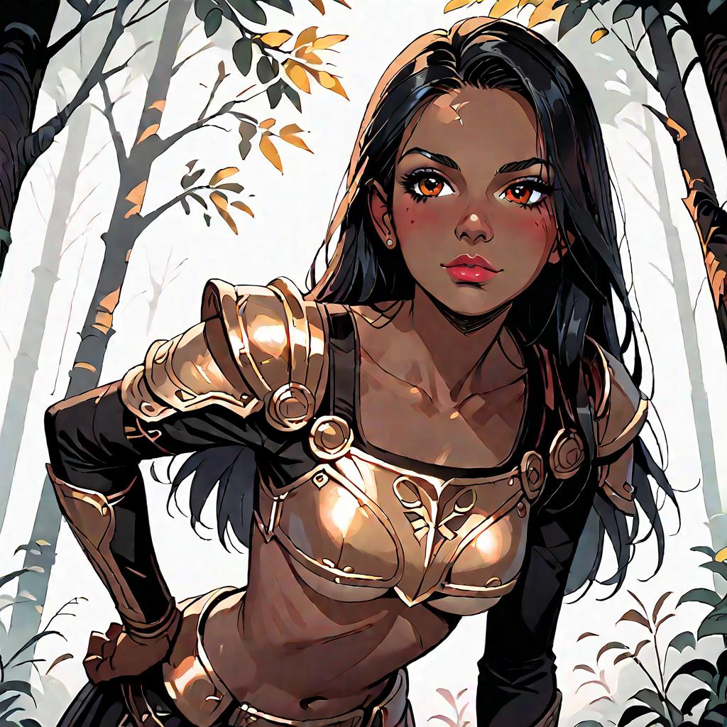 Score_9, score_8_up, score_7_up, score_6_up, source_anime, solo, 1girl, close-up, from below, dark skin, leaning forward, black hair, yellow eyes, upper body, parted hair, blush, worried, collarbone, jewelry, small_breasts, underboob, crop top, hand on hip, serious, very_long_hair, looking at viewer, leather armor dress, beautiful_detailed_eyes, standing, forest
