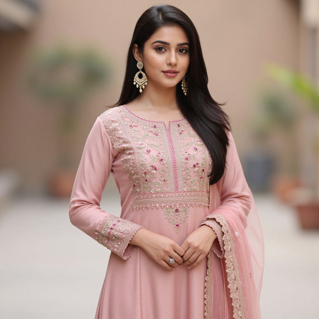 Daily wear pakistani suits, 1girl, solo, jewelry, long hair, earrings, dress, looking at viewer, blurry background, blurry, pink dress, black hair, k-pop, realistic, ring, long sleeves, standing