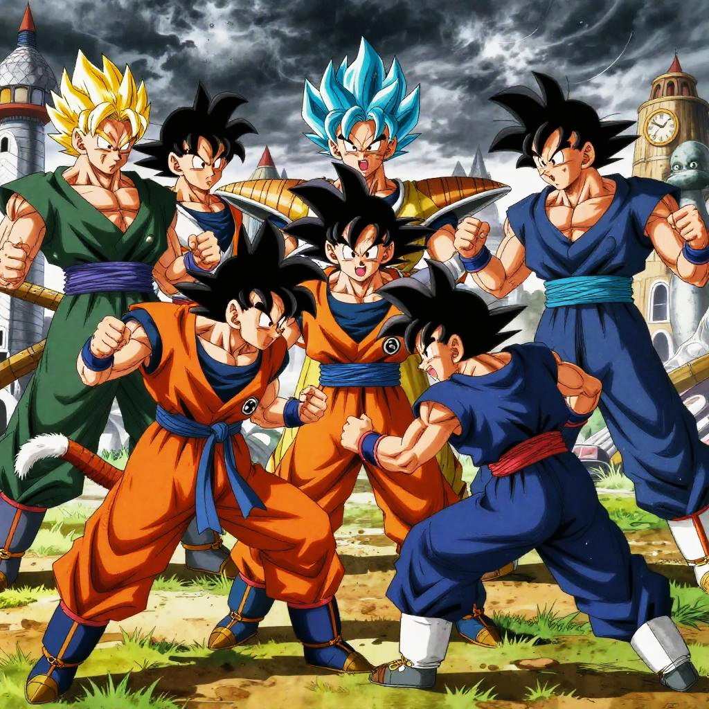 The cartel and Dragon Ball collide in an epic showdown, fierce warriors inspired by anime style face off under a stormy sky, vibrant colors, dynamic action scene.
