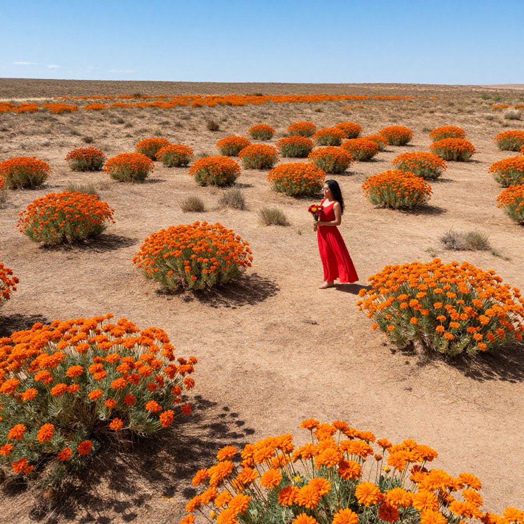Desert landscape blossoms vibrantly with spiraling clusters of fiery orange flowers, their colors shifting subtly under the azure sky, as a woman in a flowing red dress stands amidst them, holding a bouquet, her presence harmonizing with the arid yet enchanting terrain.