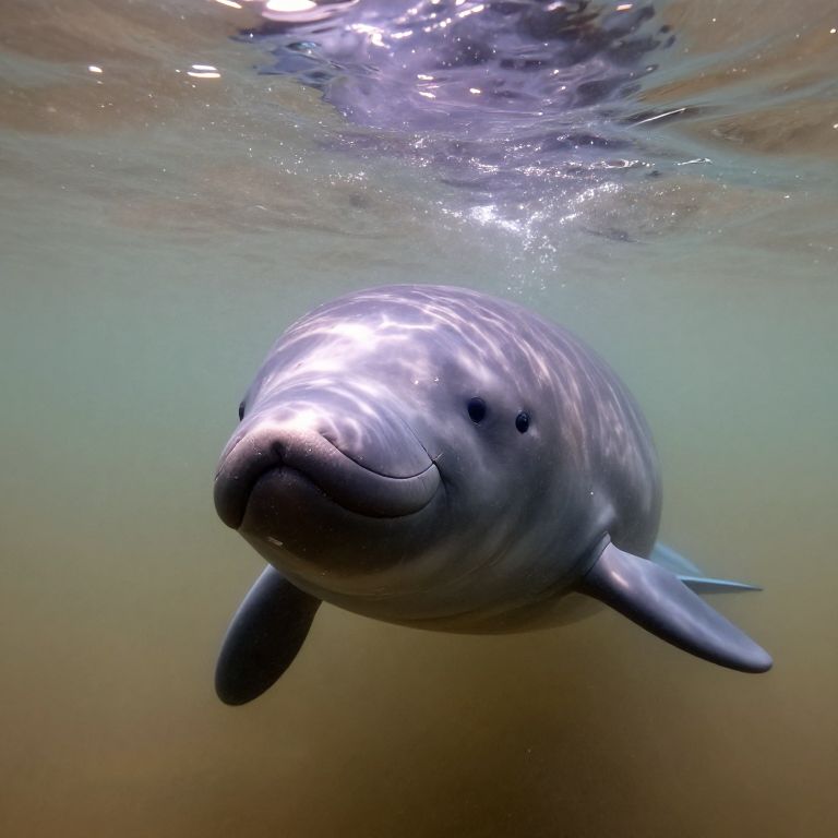 A close-up photograph of a critically endangered vaquita porpoise swimming in the murky waters of the Gulf of California, with sunlight filtering through the surface above, highlighting the delicate structure of its face and the subtle patterns on its body.