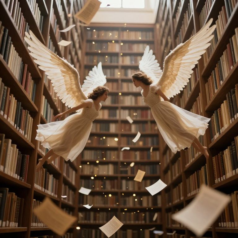 Two ethereal figures with wings crafted from delicate parchment soar gracefully between towering bookshelves, surrounded by a cascade of floating pages that drift like golden confetti in a library transformed into a surreal, dreamlike realm.