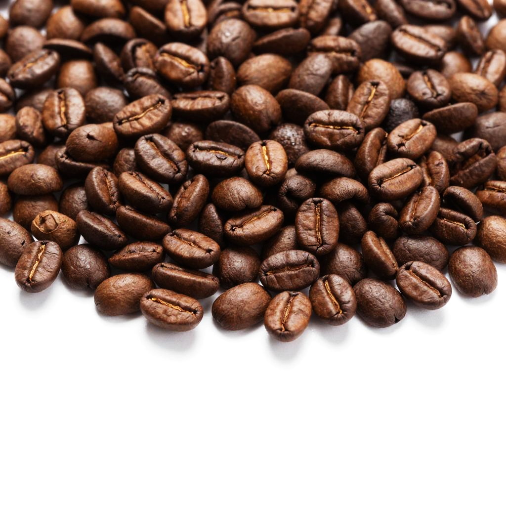 Photograph of a large pile of dark brown coffee beans, with varying shades from light to dark, creating a textured, rich look. The beans are scattered densely, covering the top two-thirds of the image, while the bottom third is a stark white background, creating a striking contrast. The beans have a glossy, slightly oily surface, highlighting their freshness.