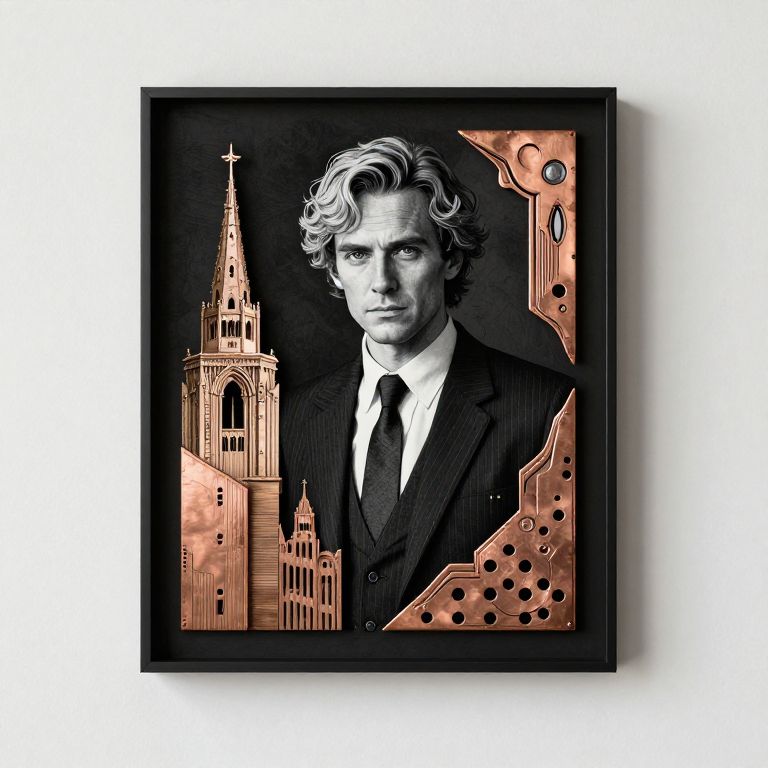Digital artwork of a serious-looking white man with wavy, light blond hair, wearing a black pinstripe suit and white shirt, with a black tie. He has a strong jawline and intense blue eyes. The background features a black and copper-colored architectural design with a tall church steeple on the left and geometric shapes on the right. The image has a high-contrast, noir style with heavy use of black, white, and copper tones, creating a dramatic and moody atmosphere. The artwork is framed in black.