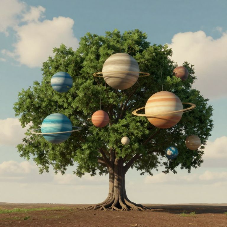 Digital artwork of a tree with planets (Jupiter, Saturn, Uranus, Neptune, Earth) hanging from its branches in a clear sky.